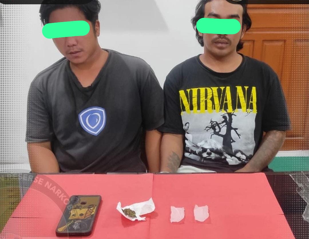 saat dilakukan penggeledahan terhadap keduanya ditemukan barang bukti sebanyak 1 paket berisikan potongan daun lering diduga narkotika jenis Ganja.