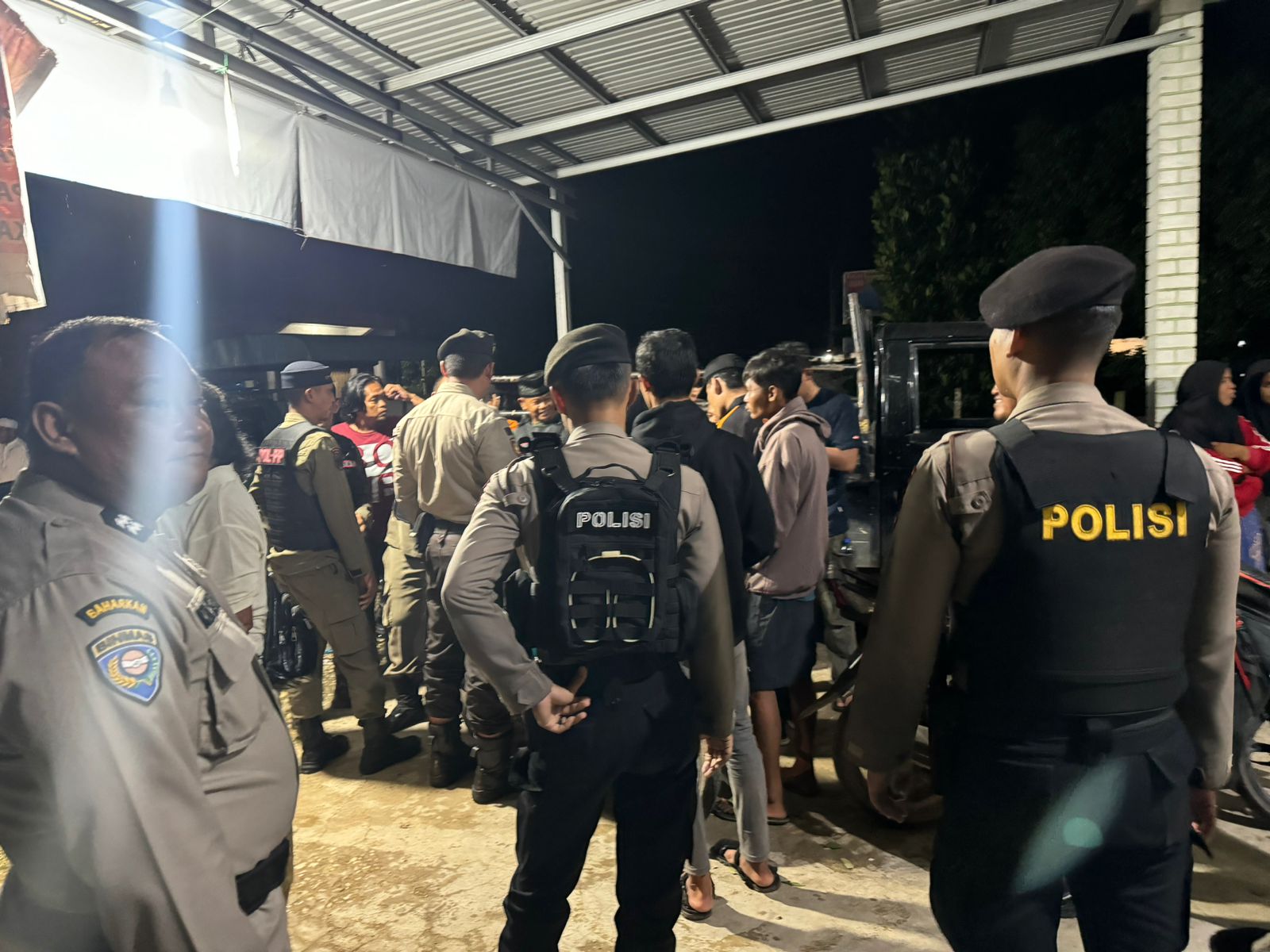 Sesampainya dilokasi, Tim Gabungan mengamankan delapan remaja yang diduga akan melakukan aksi tawuran/perang sarung bersama barang bukti 5 (Lima) helai kain sarung yang telah dibentuk sedemikian rupa, 1 (Satu) bilah senjata tajam jenis egrek dan empat unit sepeda motor.