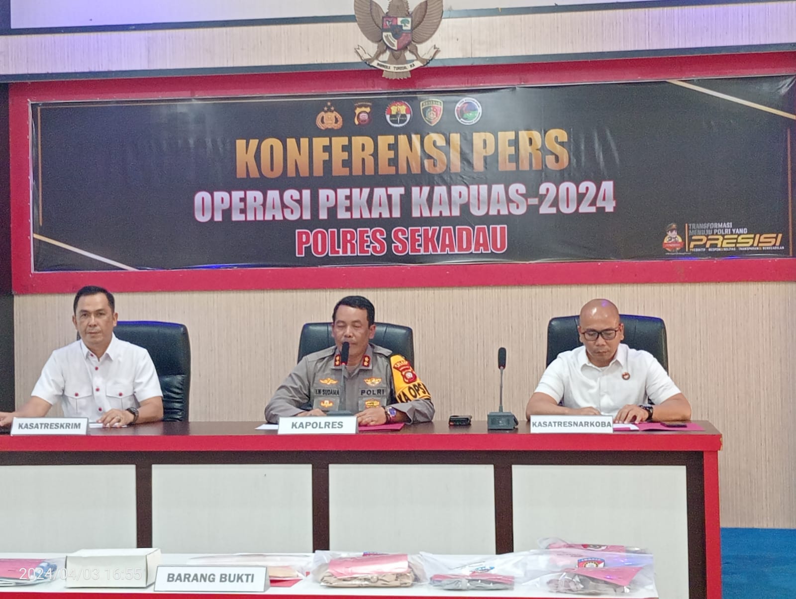 Sekadau, Mentarikhatulistiwa.co.id. Kepala Kepolisian Resor Sekadau Kapolres Sekadau AKBP I Nyoman Sudama didampingi Kasat Reskrim AKP Rahmad Kartono serta Kasatresnarkoba IPTU Robianto menyampaikan Target Operasi (TO) Pekat Kapuas Januari-Maret 2024 dalam Konferensi Pers yang dilaksanakan bertempat di Aula Bhayangkara Patriattama Mapolres Sekadau Jalan Merdeka Timur No. 01 Desa Mungguk Kecamatan Sekadau Hilir Kabupaten Sekadau Provinsi Kalimantan Barat, Rabu, 3 April 2024.