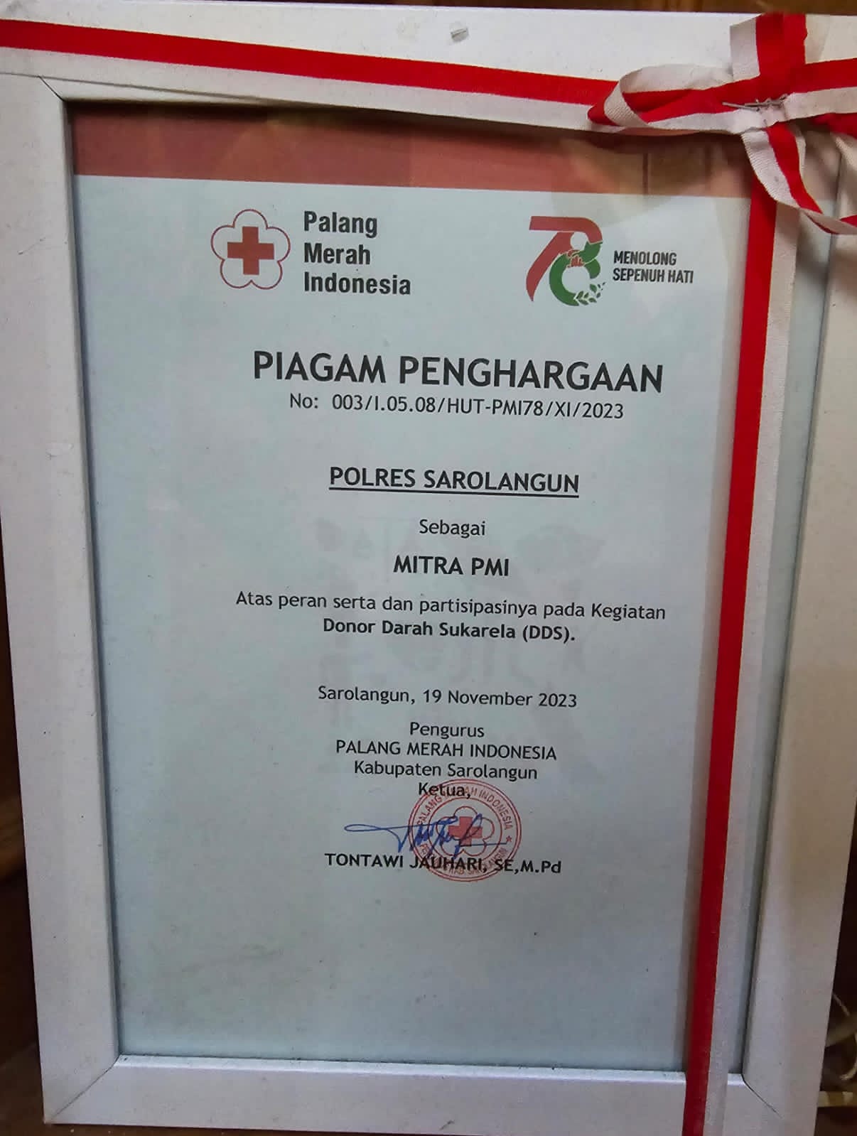 Diterimanya piagam penghargaan sebagai relawan pendonor darah aktif dari Palang Merah Indonesia (PMI) cabang Sarolangun kita harapkan dengan melakukan Donor darah Rutin oleh personil aktif diharapakan membantu warga yang membutuhkan.