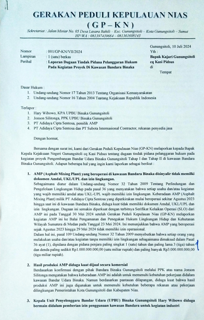 Menurut Darwis Zendrato, laporan yang diajukan mencakup beberapa poin krusial yang menjadi perhatian GP-KN. Salah satunya adalah perizinan lingkungan dari AMP (nama perusahaan atau entitas terkait proyek) yang beroperasi di sekitar Bandara Binaka.