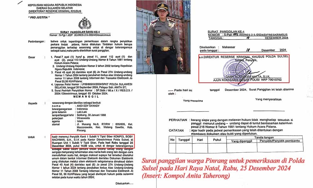 Jakarta, mentari khatulistiwa.co.id– Kelakuan para wereng coklat alias oknum polisi dimana-mana sudah amat keterlaluan. Perilaku bejat sebagian di antara mereka bahkan sudah melebihi iblis. Bagaimana tidak, hari ini, Selasa, 24 Desember 2024, seorang warga di Pinrang bernama Andi Edi Sandy mendapatkan surat panggilan untuk pemeriksaan di Polda Sulawesi Selatan pada esok hari, Rabu, 25 Desember 2024, yang adalah tanggal merah, hari libur, dan merupakan Hari Besar Umat Kristiani, yakni Hari Natal.