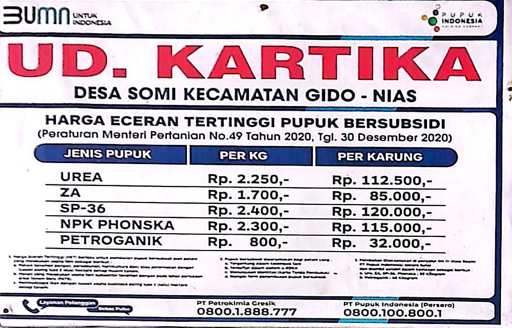 Namun, belakangan muncul pemberitaan yang menyebut kios pengecer UD Kartika, yang berlokasi di Desa Somi, Kabupaten Nias, menjual pupuk bersubsidi dengan harga jauh di atas HET. Dalam laporan tersebut, petani disebut membeli pupuk NPK dengan harga Rp160.000 hingga Rp170.000 per karung, dan pupuk urea dengan harga Rp145.000 per karung. Menanggapi hal ini, pemilik UD Kartika dengan tegas menyebut tudingan tersebut tidak benar dan menyesatkan.