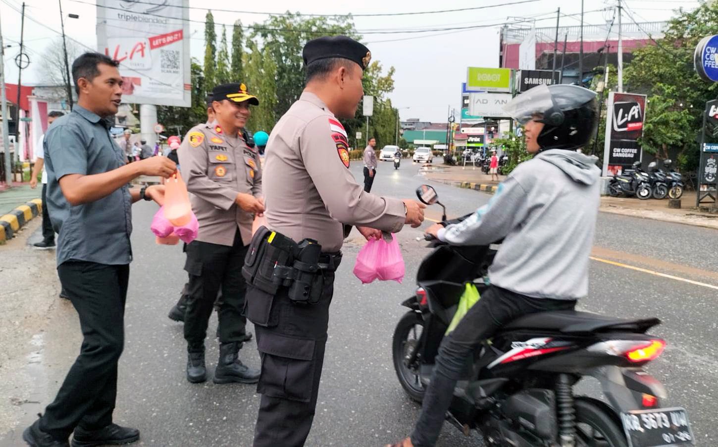 Sebanyak 150 paket takjil dibagikan kepada para pengguna jalan, termasuk pengendara roda dua maupun roda empat, sebagai bentuk kepedulian Polri terhadap masyarakat yang sedang menjalankan ibadah puasa.