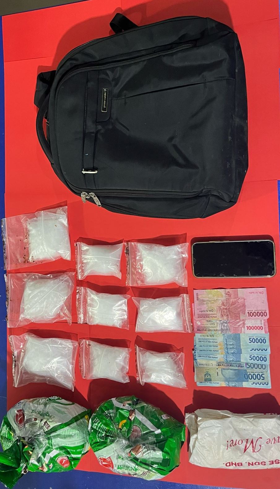Selain sabu, polisi juga mengamankan sejumlah barang bukti lainnya, termasuk dua bungkus Milo Malaysia seberat 1,8 kg, satu unit handphone Realme warna biru, uang tunai sebesar Rp500.000, dua tas merek Pierre Cardin warna hitam, serta satu kantong plastik bertuliskan “KIAN HIN ENTERPRISE SDN. BHD.”