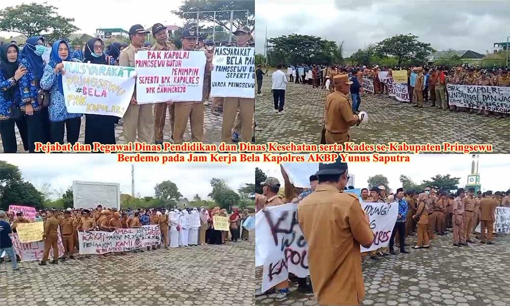 Lampung, mentari khatulistiwa.co.id- Sejumlah pejabat dan pegawai ASN dari tiga instansi berbeda menggelar aksi damai di Pringsewu, Lampung, Senin, 17 Maret 2025. Aksi tersebut menuntut agar Kapolres Pringsewu, AKBP M Yunus Saputra, tidak dicopot dari jabatannya. Para demonstran menyuarakan orasi dengan tujuan mempertahankan posisi sang Kapolres. Mereka mengenakan pakaian seragam instansi masing-masing, yakni Dinas Pendidikan Pringsewu, Dinas Kesehatan Pringsewu, dan para Kepala Pekon (Kepala Desa) se-Kabupaten Pringsewu.