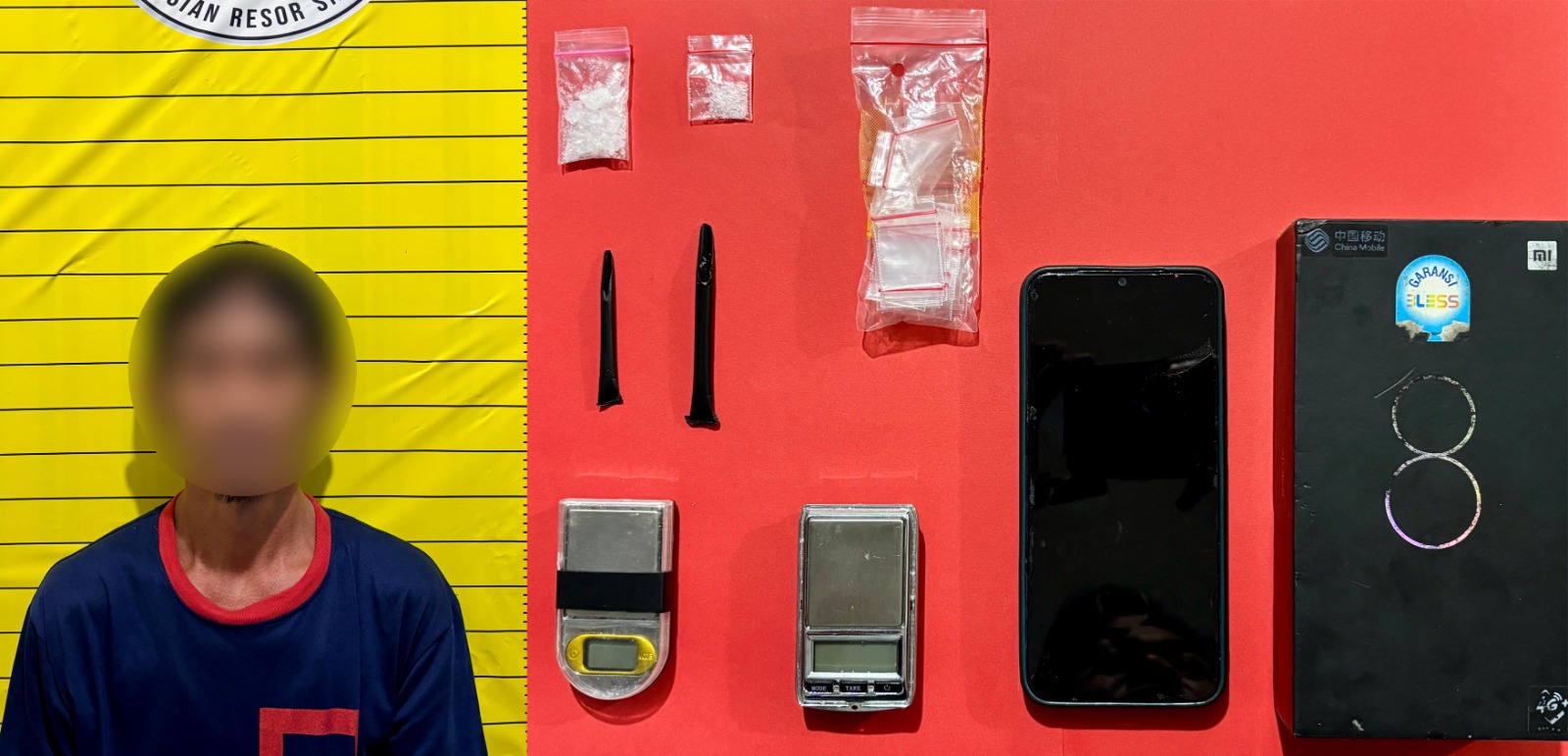 Di antaranya dua unit timbangan digital warna hitam, dua buah sendok sabu yang terbuat dari pipet plastik hitam, satu bundel plastik bening berklip, satu unit ponsel merek Vivo warna abu-abu, dan satu buah kotak warna hitam.