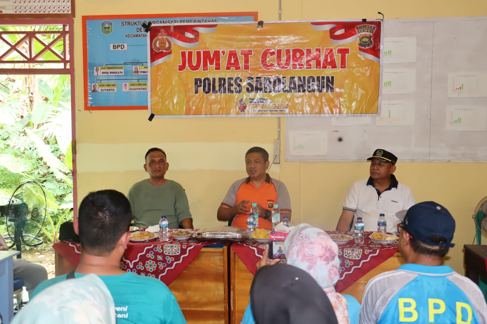 Usai bergotong royong ,Kapolres Sarolangun bersama Bupati Sarolangun ,H.Hurmin SE beserta pejabat utama Pemkab Sarolangun dan Polres Sarolangun .Melakukan giat Jum”at Curhat di Desa Sido Mukti Kecamatan Singkut .