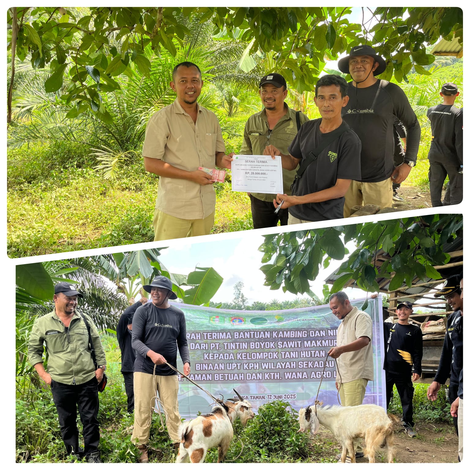 Sekadau, Mentarikhatulistiwa.co.id. PT Tinting Boyok Sawit Makmur (TBSM) memberikan bantuan 10 ekor Kambing dan 100 Kg bibit Nilam kepada Kelompok Tani Hutan Taman Betuah dan KTH Wana Agro Lestari Nanga Taman. Bantuan ini diberikan sebagai bentuk komitmen Perusahaan dalam mendukung 3 program pemerintah sekaligus, yaitu Pemberdayaan Masyarakat, Ketahanan Pangan dan Pelestarian Hutan, Selasa (10/6/25)