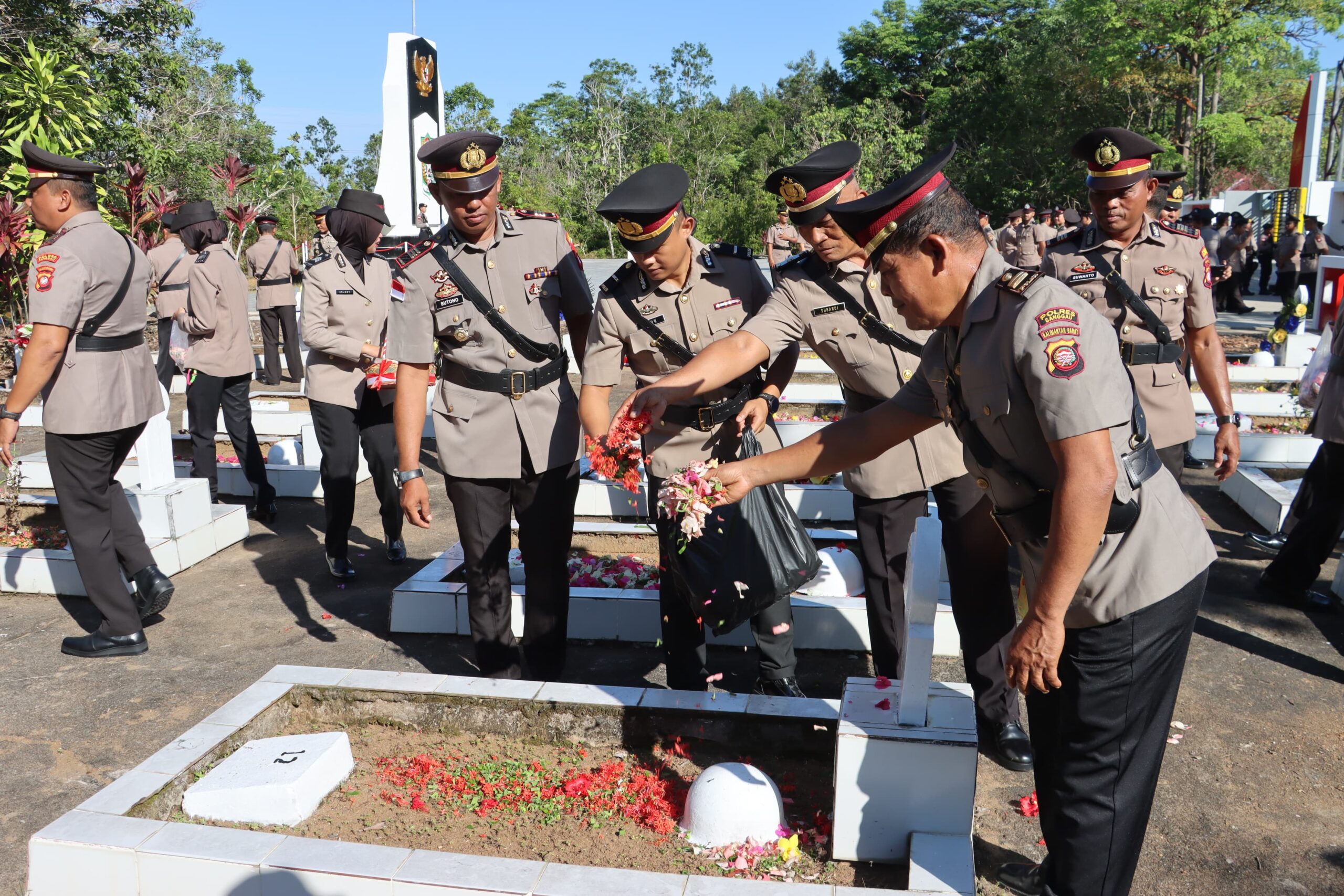 Prosesi penaburan bunga di atas pusara para pahlawan menjadi bagian yang paling sarat makna. Diawali oleh Wakapolres Sanggau, kemudian diikuti oleh PJU Polres, perwira, serta seluruh peserta ziarah. Setiap taburan bunga menjadi simbol penghormatan atas pengorbanan para pejuang yang telah gugur demi kemerdekaan Negara Kesatuan Republik Indonesia.
