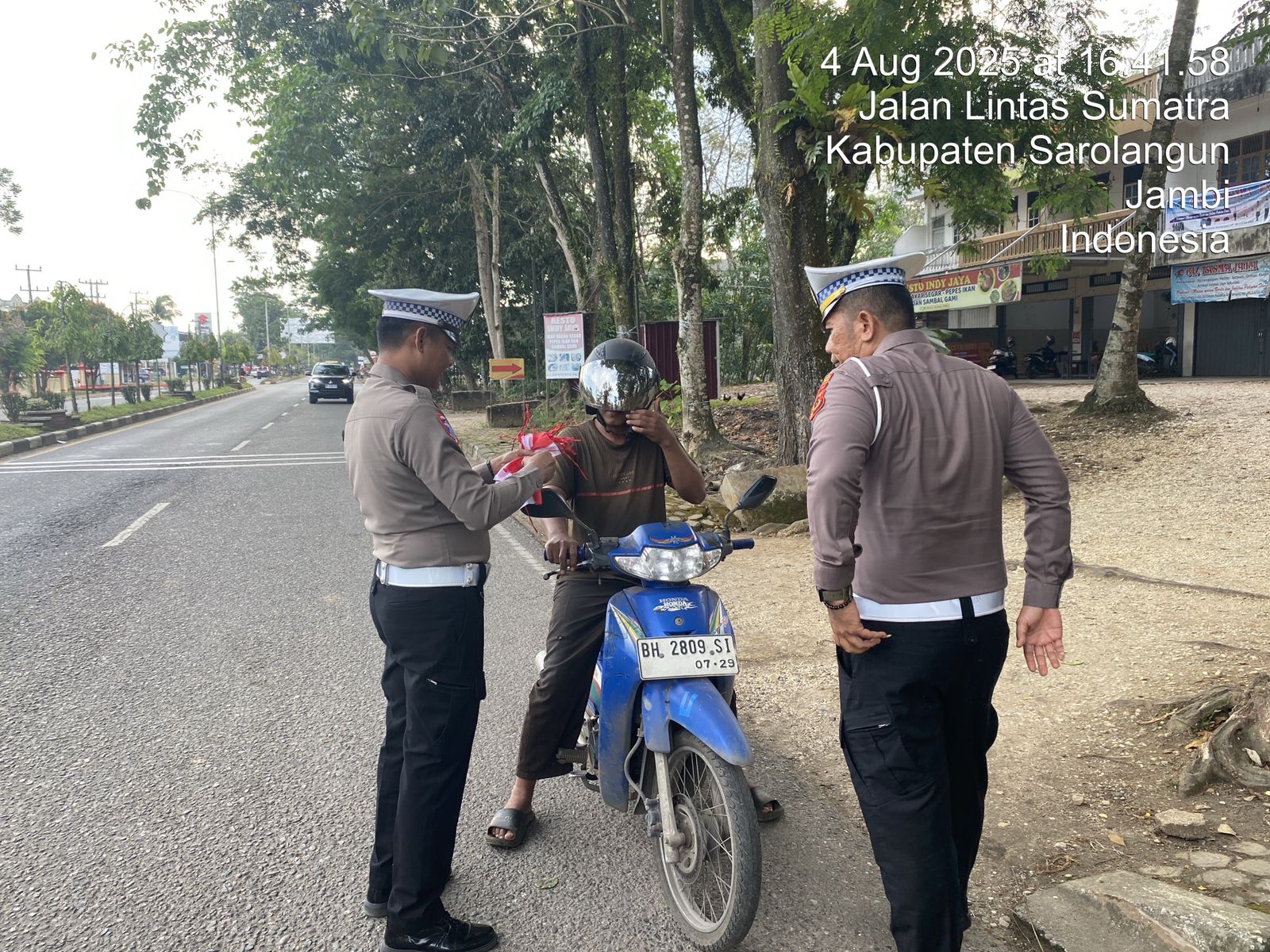 Bangkitkan Semangat Nasionalisme Jelang HUT RI ke-80, Polres Sarolangun Bagikan Bendera Merah Putih kepada Masyarakat.