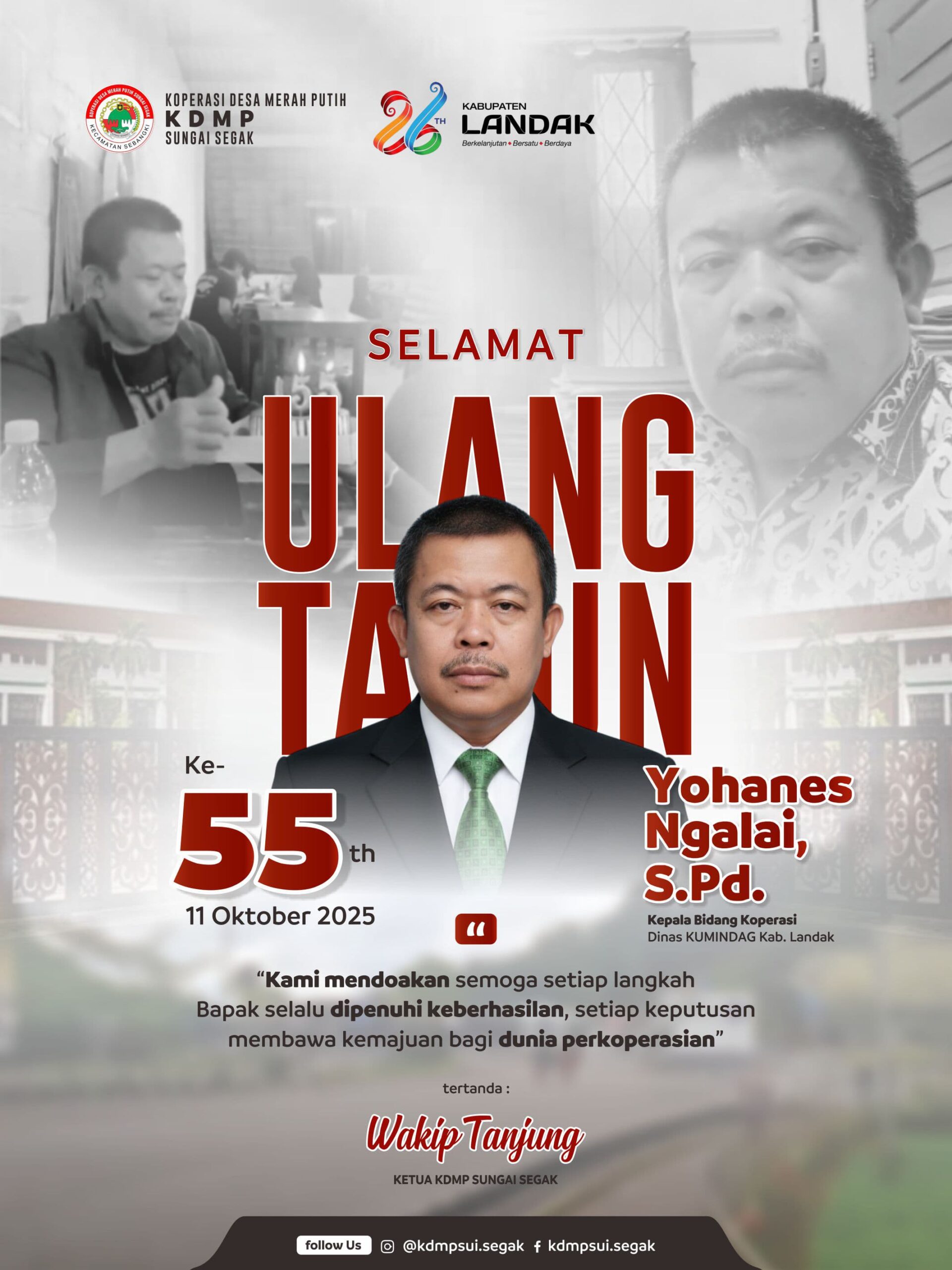 “Atas nama keluarga besar Koperasi Desa Sungai Segak, kami mengucapkan selamat ulang tahun kepada Bapak Yohanes Ngalai, S.Pd. Semoga selalu sehat, panjang umur, dan terus menjadi pemimpin yang bijaksana serta inspiratif dalam membangun perekonomian masyarakat Kabupaten Landak,” tutur Wakip Tanjung.