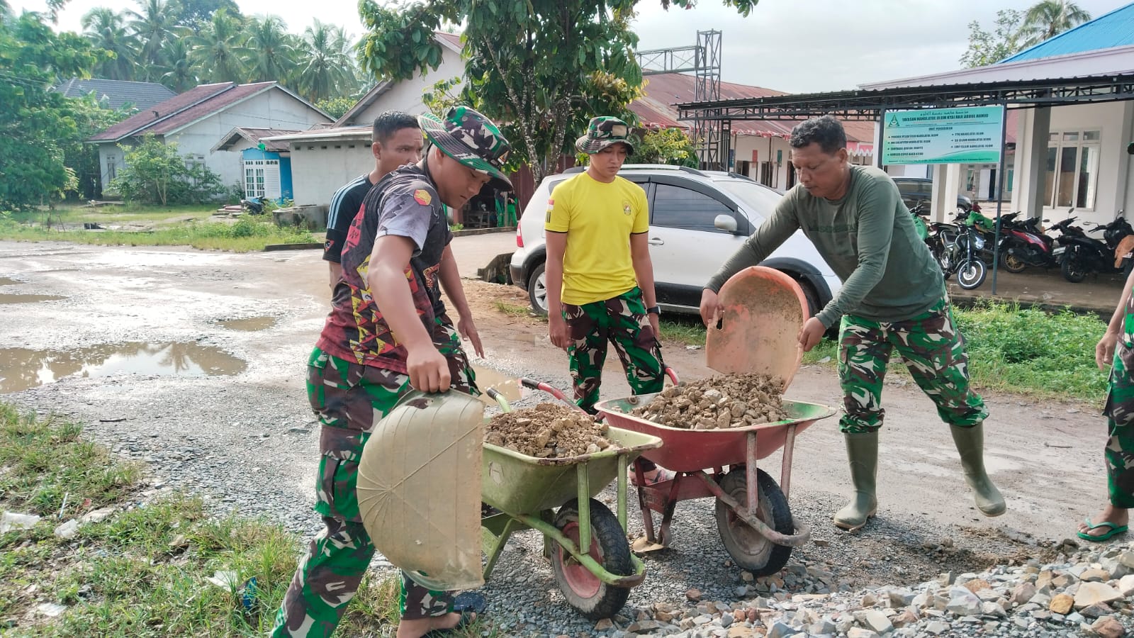 “Tujuan pengurugan ini menutupi di area yang lembek dan berlubang dilakukan sebagai pondasi awal sebelum dilakukan pengecoran.” Ungkap Dansatgas TMMD