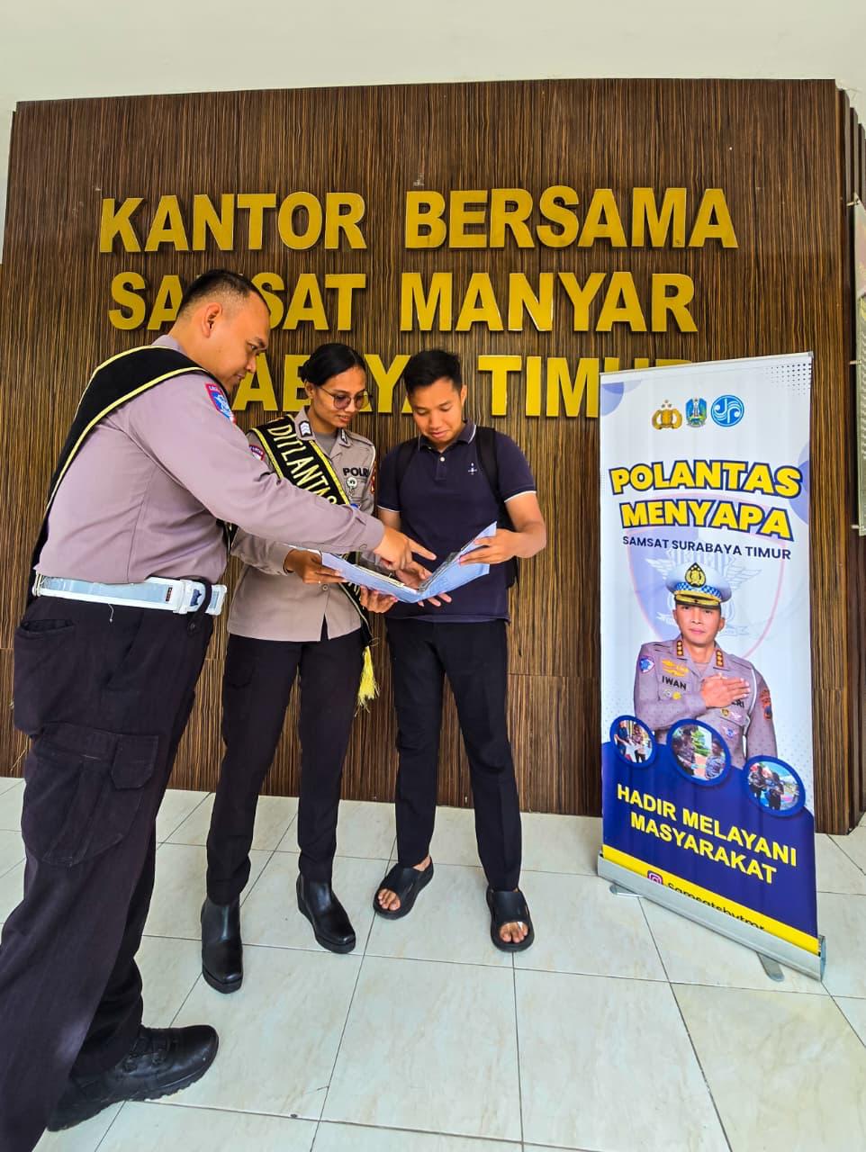 Khususnya dalam pelayanan kepada wajib pajak, Ditlantas Polda Jawa Timur mempunyai program unggulan “Polantas Menyapa”. Dimana petugas pelayanan memberikan edukasi dan info terkini kepada wajib pajak bagaimana cara melakukan pengurusan administrasi kendaraan bermotor sehingga masyarakat mengetahui pengurusan yang akan dilakukan di samsat.