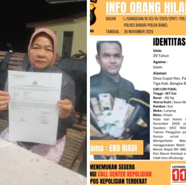 Jebus Mentari Khatulistiwa.co.id 30 Nopember 2025 – Harapan besar disampaikan keluarga Eko Riadi, warga Desa Cupat Kecamatan Jebus, yang sejak 20 November 2025 belum kembali ke rumah dan dinyatakan hilang. Keluarga korban, yang tinggal di kawasan Groban, mengungkapkan rasa cemas sekaligus berharap penuh agar Eko segera ditemukan dalam keadaan selamat.