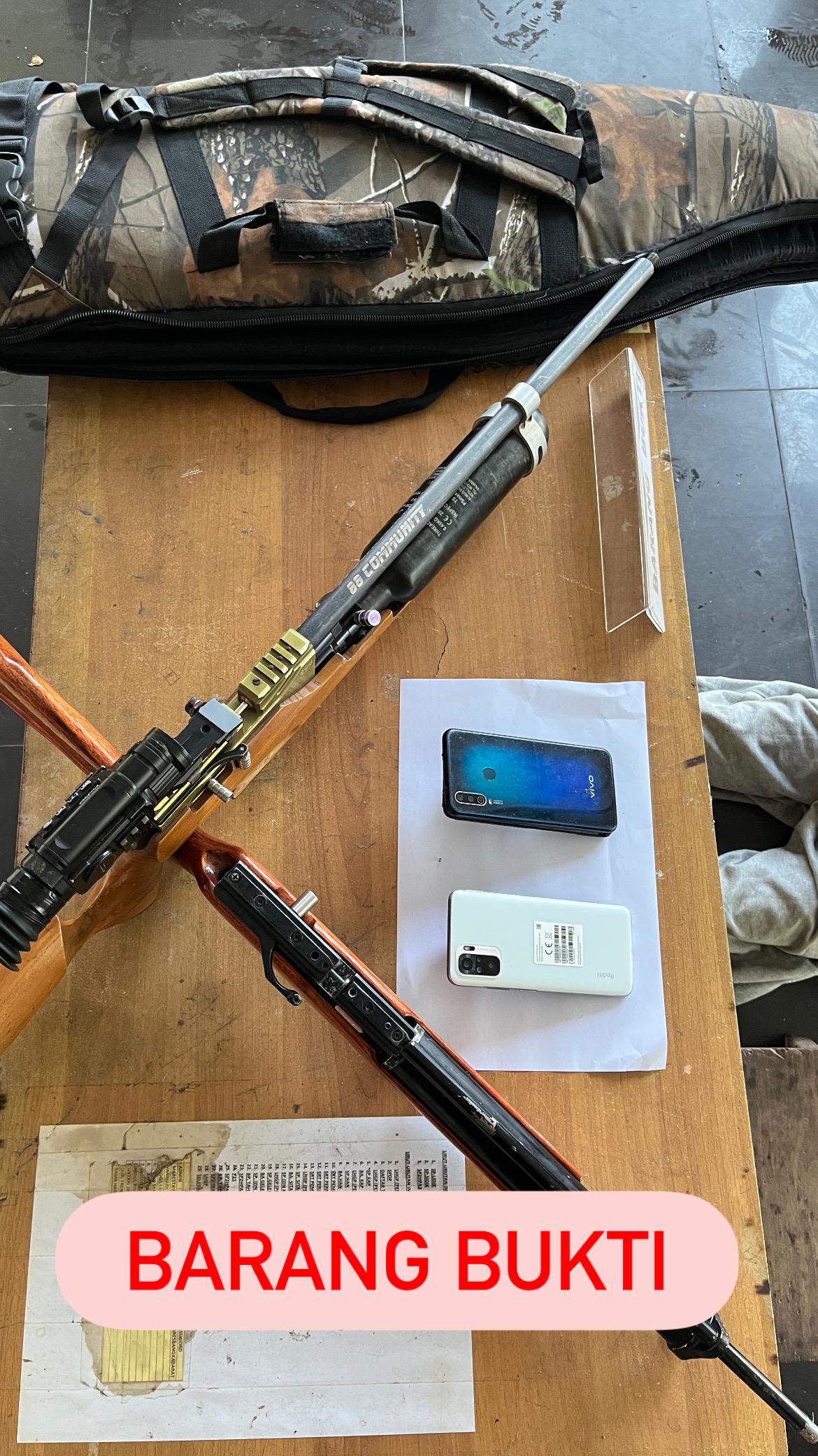 Barang bukti yang diamankan meliputi 2 unit handphone, 2 pucuk senapan angin gas, 1 sarung tas senapan dan 1 kursi kayu