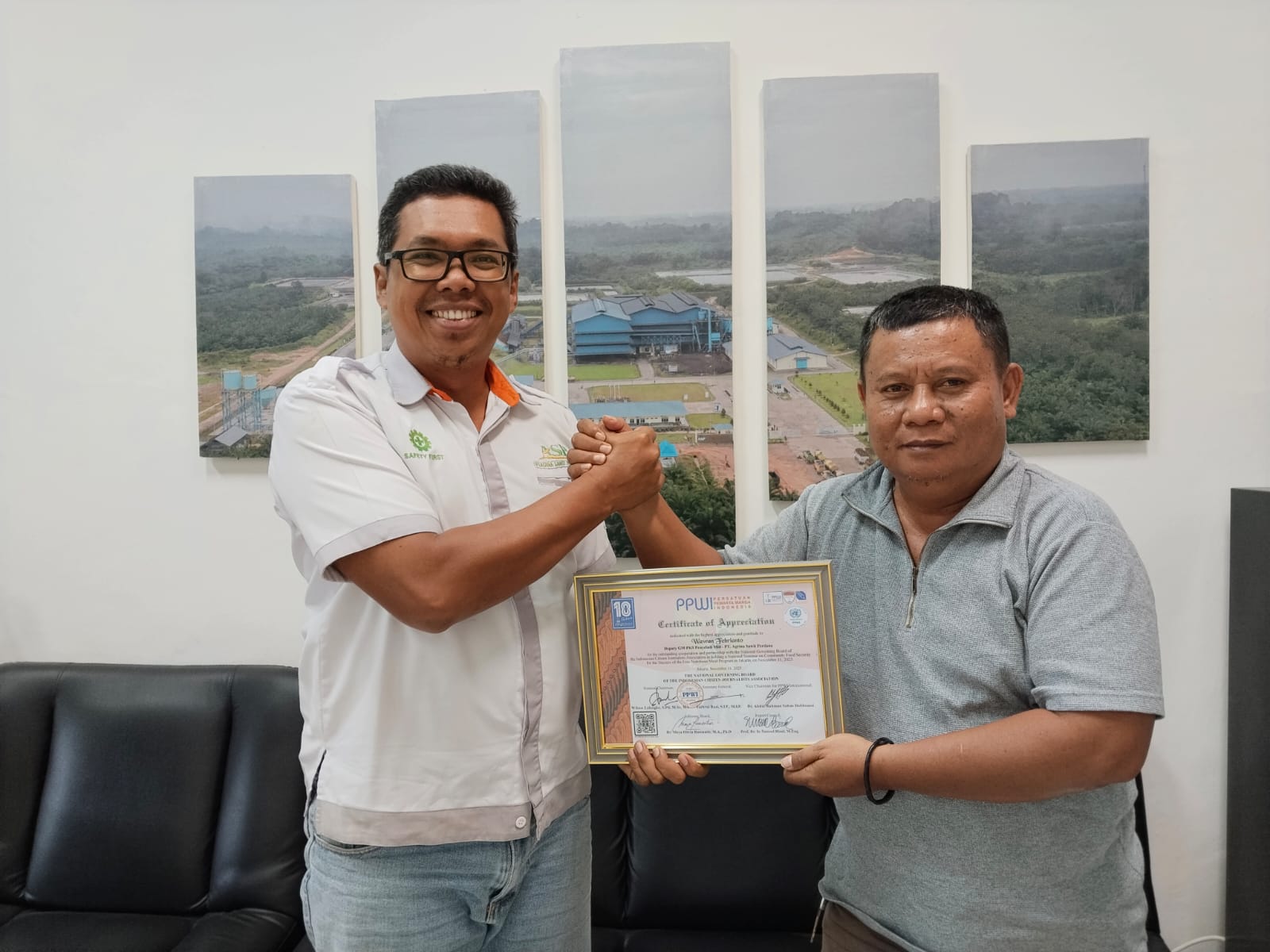 Sanggau, Mentari khatulistiwa.co.id– Ketua Dewan Pimpinan Cabang Persatuan Pewarta Warga Indonesia (DPC PPWI) Kabupaten Sanggau, Sutrisno, memberikan Certificate of Appreciation kepada Production Head Jumartlin T. Purba melalui Wawan Febrianto, Deputy GM Mill PKS Penyeladi – PT Agrina Sawit Perdana (ASP). Selasa 9 /12/2025