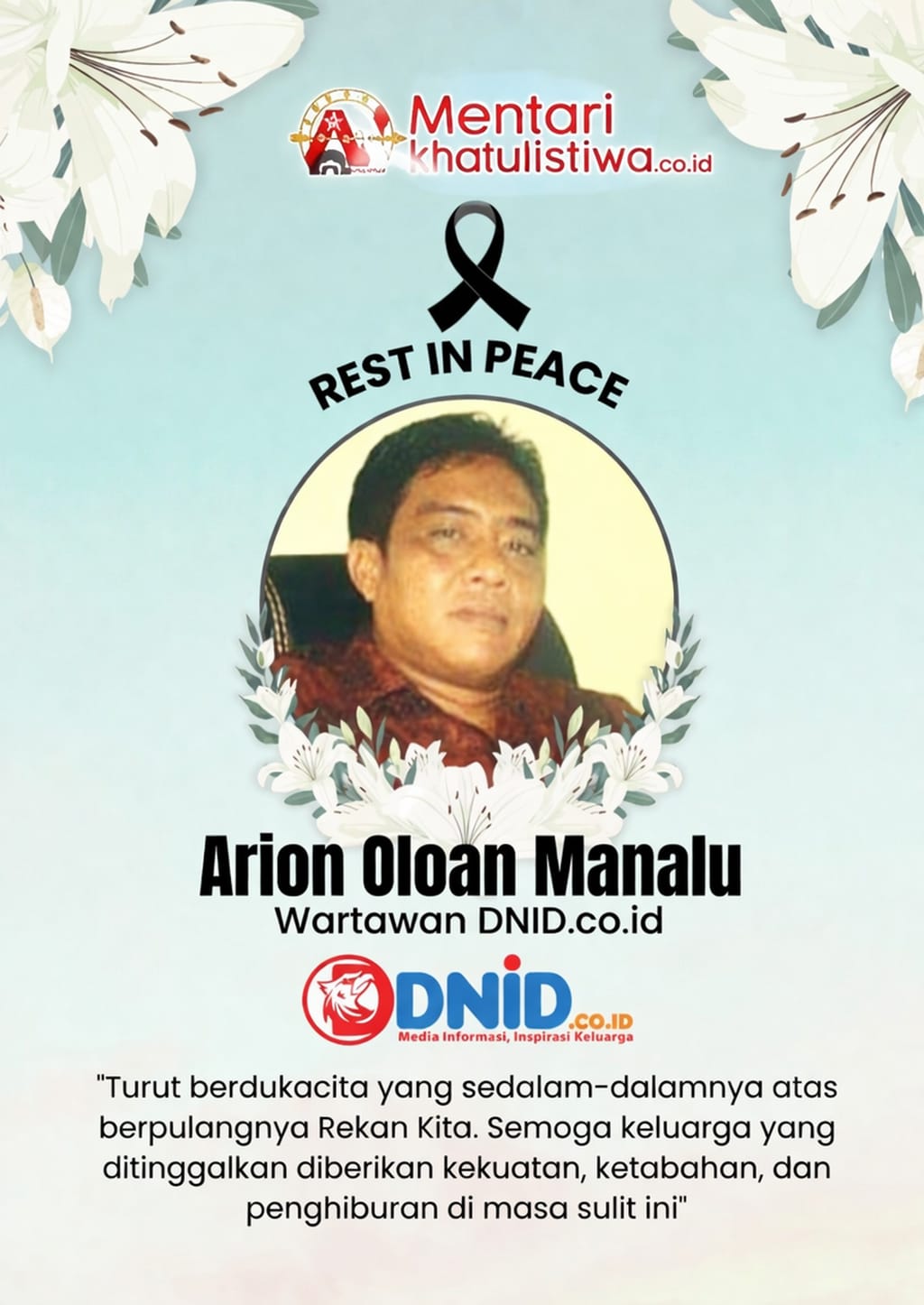 Kepergian Arion Oloan Manalu meninggalkan duka mendalam bagi komunitas pers di Melawi. Semasa hidupnya, almarhum dikenal sebagai sosok jurnalis yang memiliki dedikasi tinggi dan integritas dalam menjalankan tugas-tugas jurnalistik.
